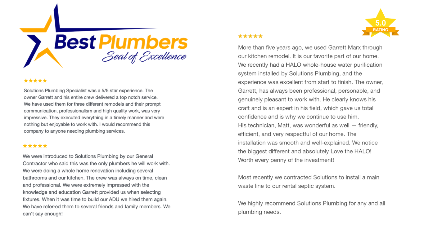 Solutions Plumbing Specialist takes pride in providing a second to none customer experience. We are family owned and operated out of San Diego, Ca. We specialize in new construction, remodels and commercial plumbing. Our goal is to provide our clients with quality craftsmanship. We have over 20 years of industry experience and look forward to partnering with you on your next project. We are licensed, bonded and insured. CA LIC# 1050436